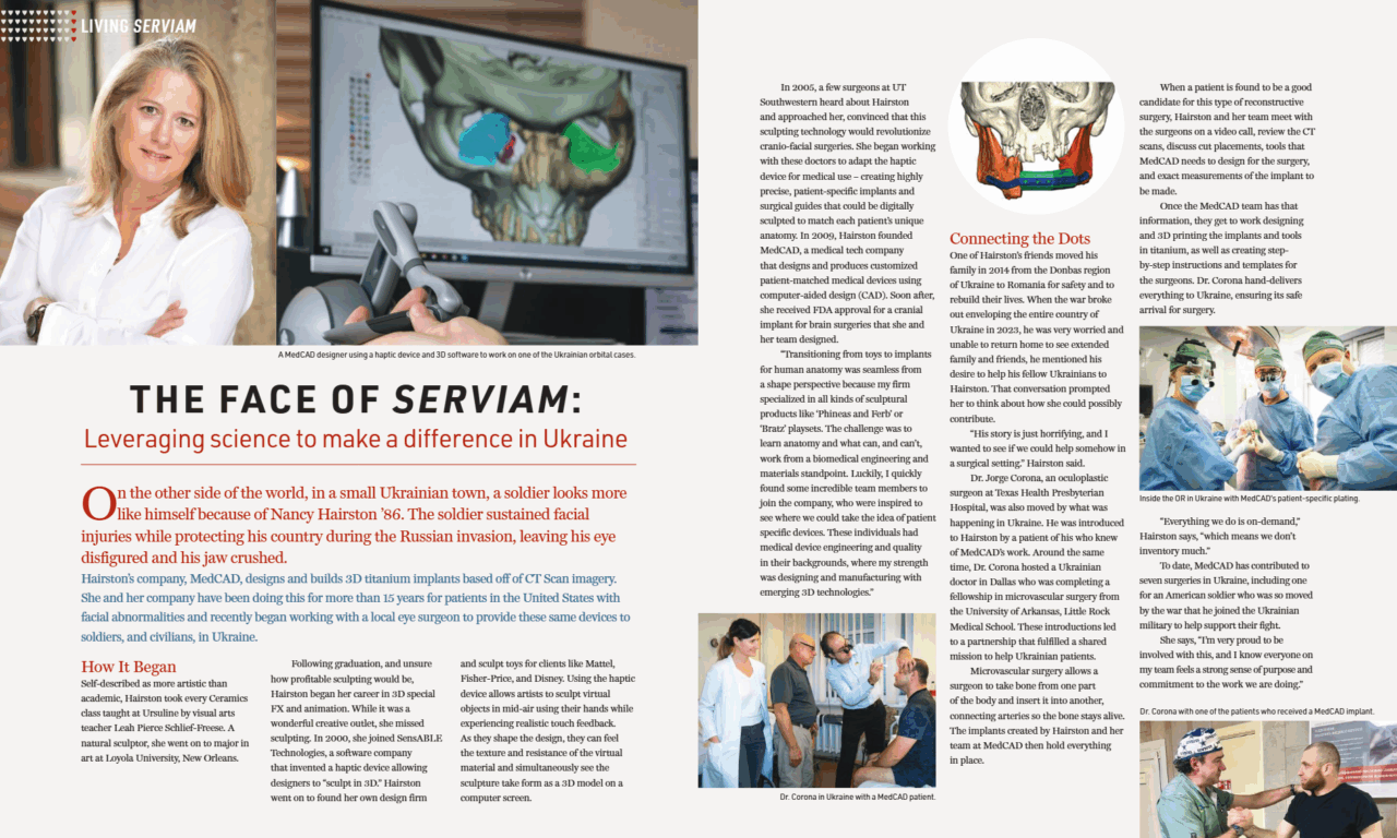 Hairston’s company, MedCAD, designs and builds 3D titanium implants based off of CT Scan imagery. She and her company have been doing this for more than 15 years for patients in the United States with facial abnormalities and recently began working with a local eye surgeon to provide these same devices to soldiers, and civilians, in Ukraine.